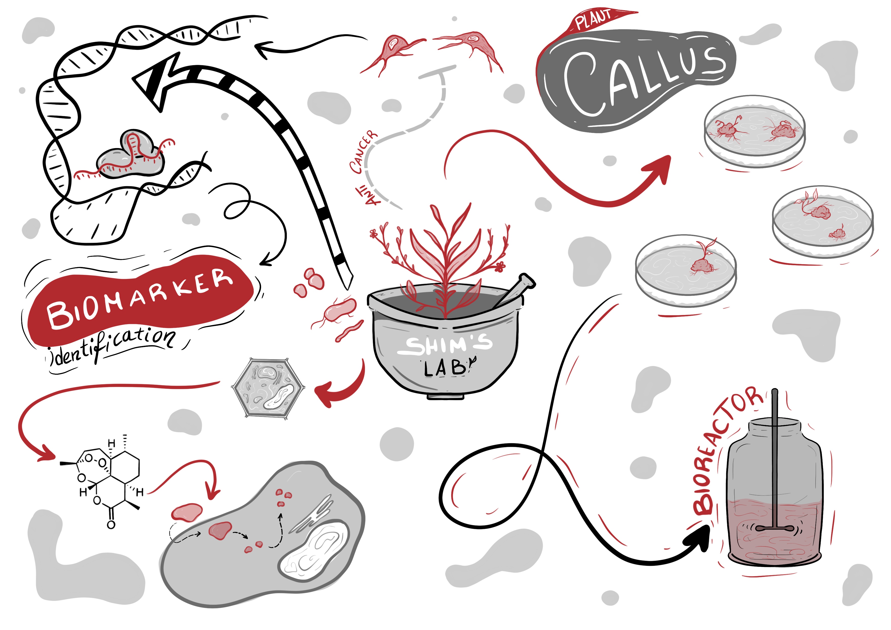 Our lab primarily conducts research on four major anti-cancer medicinal plants. First, we analyze the plants’ genetic information and pinpoint the core genes involved in anti-cancer substance synthesis. Then, we develop plant cell culture methods that can generate the metabolites at a massive scale with high efficiency. In addition to this research, we are also developing novel CRISPR/Cas tools by analyzing complete sets of microbiological data to pioneer digital breeding in medicinal plants.